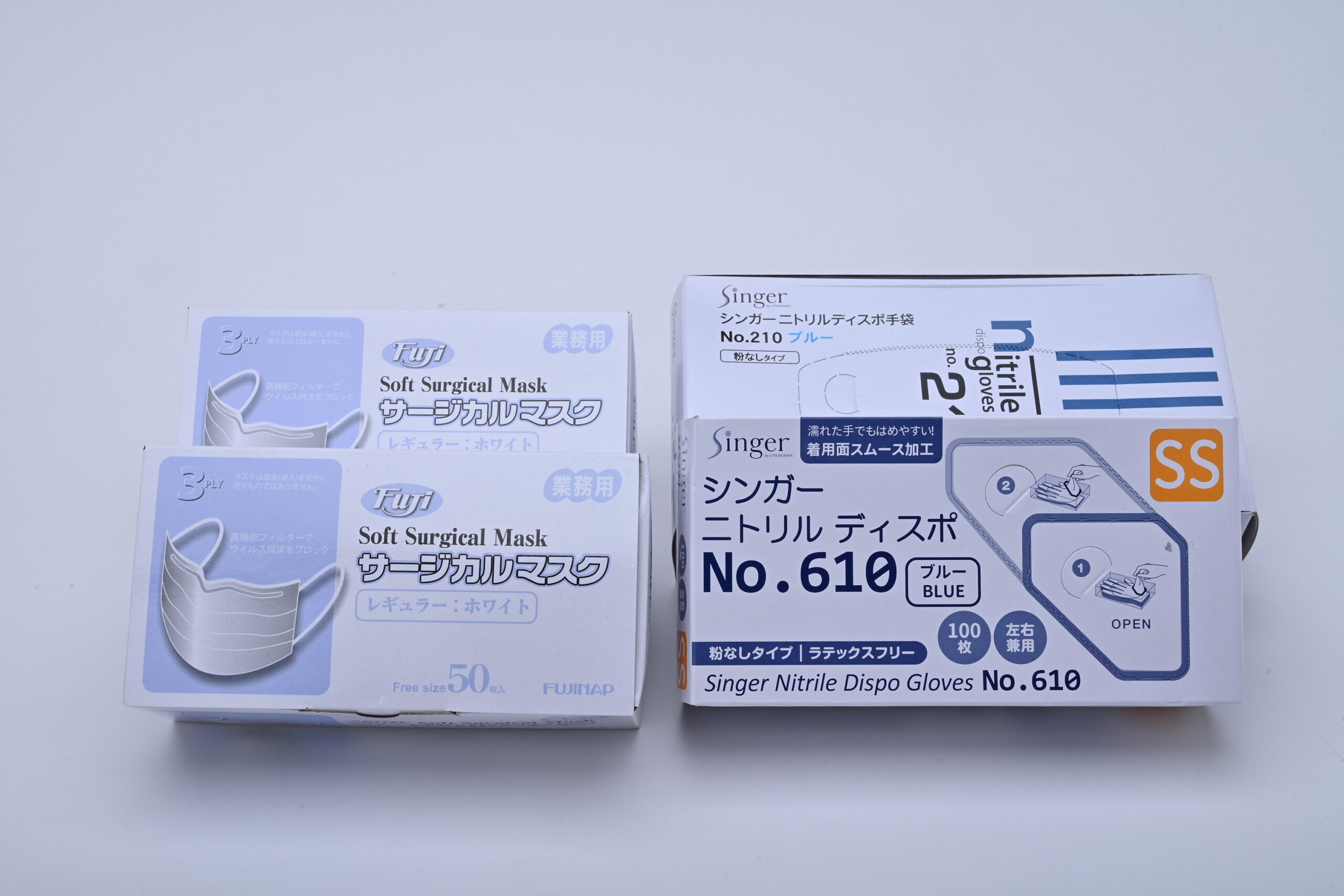 マスクは医療の現場でも使われているフィルターが三層構造のサージカルマスクや一般的な不織布マスクなどを取り扱っており、手袋はSSサイズからLLサイズまでと幅広いサイズに加え、手にはめやすい粉付きのものなどを取り扱っております。